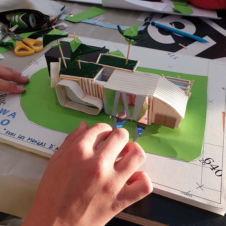 Le stage était rythmé entre rencontres avec des professionnels pour favoriser l'échange, des visites de chantiers et d'agences d'architecture pour connaitre le milieu, et de la production autour de l'habitat individuel pour se mettre dans la peau de l'architecte. Réflexion en organigramme et dessin en plan, puis expression en volume par la réalisation d'une maquette conceptuelle de la maison imaginée, maquette expressive grâce aux papiers matières.