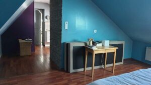 Une cloison rangement vient séparer la chambre des parents de la salle de bain. Elle camoufle l'accès à celle-ci. La salle de bain a entièrement été repensée. Elle est également accessible depuis la chambre des enfants. Quand à la chambre d'amis, une paroi rangement avec quelques alcôves décoratives est venue s'appuyer sur le mur pignon. Cette paroi cache de multiples rangements.